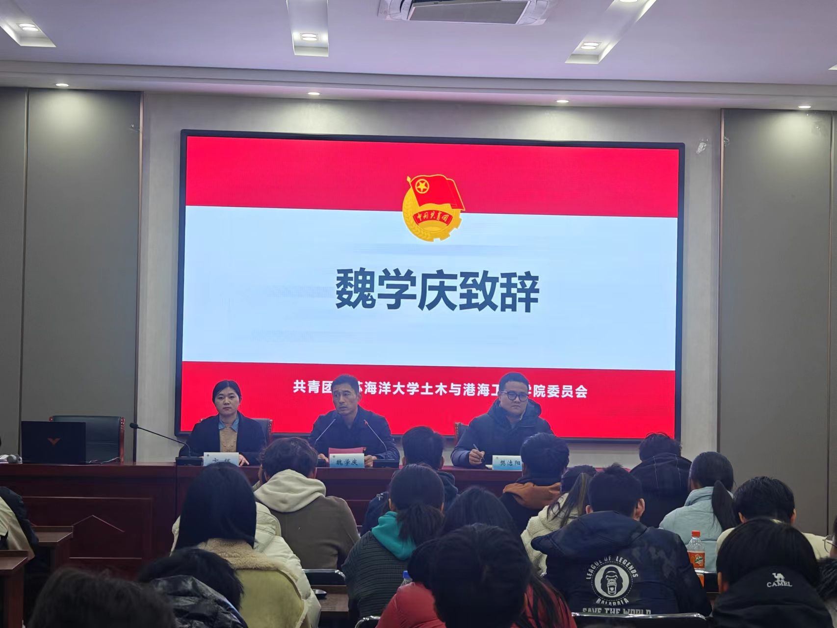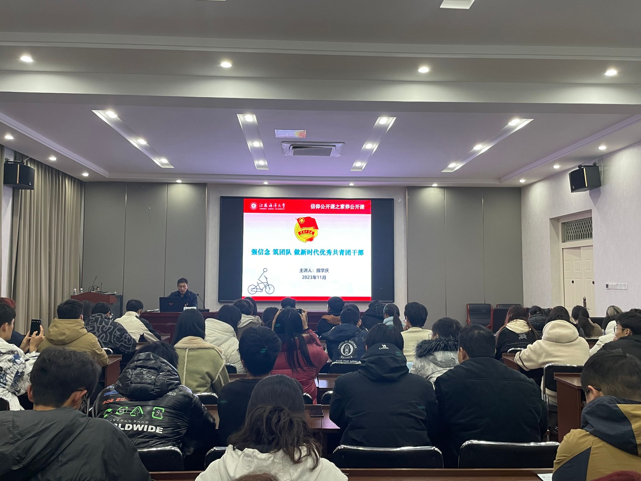 开班仪式结束后,魏学庆以“强信念,筑团队,争做新时代优秀共青团干部”为主题开展素养公开课。他从江苏海洋大学团情介绍、团干部构成岗位职责、《团支部工作手册》使用说明、团学活动年度安排、《团章》摘要学习、团干部基本素质及团学日常事务、工作中需要注意的方面等分别展开讲述,期间还分享了许多大学生常见的鲜活事例,现场反响十分热烈,学员们受益匪浅。