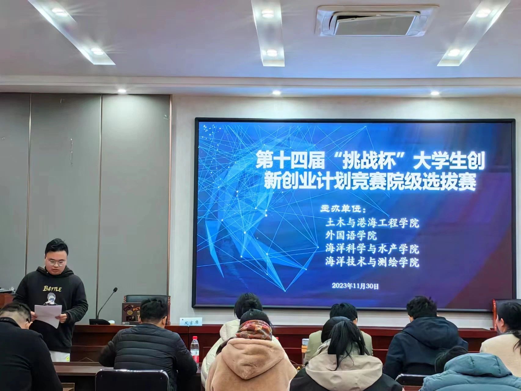 为进一步推动大学生创新创业教育工作的深入开展,培养大学生创新精神、提高大学生科研能力。2023年11月30日12时30分,由土木与港海工程学院、外国语学院、海洋科学与水产学院和海洋技术与测绘学院共同举办的第十四届“挑战杯”大学生创新创业计划竞赛院级选拔赛于江苏海洋大学苍梧校区土木楼南楼207顺利开展。