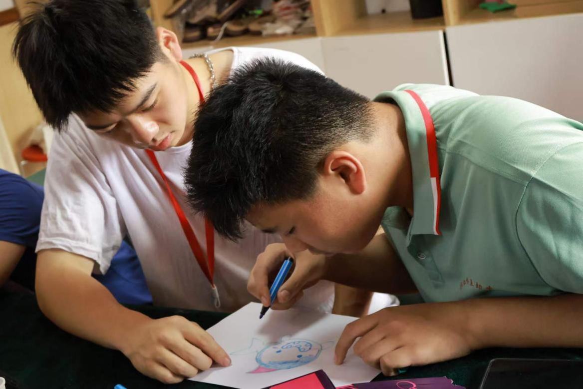 下午2点,志愿者带领孩子们进行了一次特殊的绘画体验。在志愿者悉心指导下,孩子们拿起画笔,用心描绘出了鲜艳的五星红旗和庄严的党徽。每一笔、每一划都凝聚着孩子们对党、对祖国的热爱,同时也展现了他们的艺术天赋和创造力。