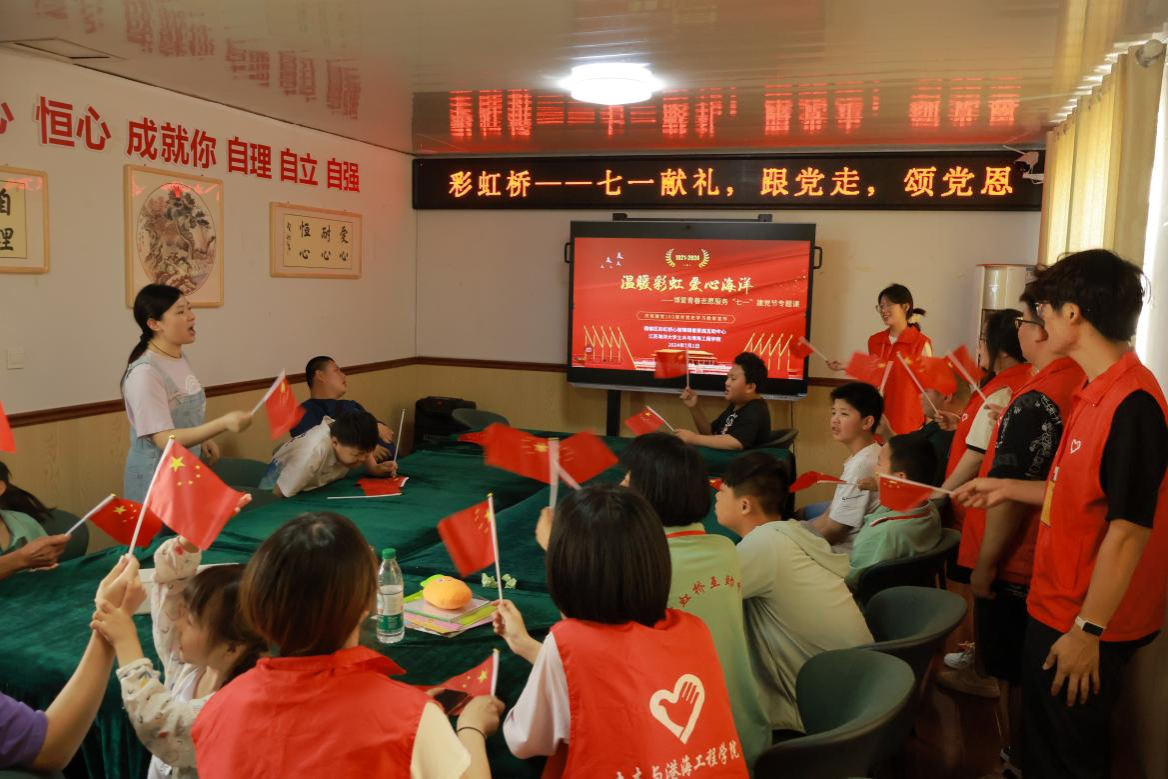 为庆祝中国共产党成立103周年,2024年7月1日,土木与港海工程学院“温暖彩虹 爱心海洋”关爱心智障碍儿童及其家庭暑期社会实践团队在赣榆区彩虹桥心智障碍者家庭互助中心进行“七一献礼,跟党走,颂党恩”党史教育学习。