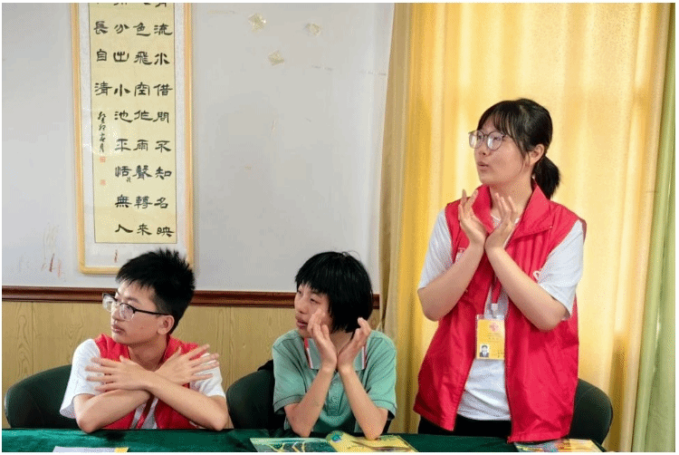 7月4日上午9点,志愿者们带领孩子们跳手势舞。这是一种充满创意与活力的舞蹈形式,通过简单的手势,传递出丰富的情感。孩子们在志愿者的指导下,舞动着手臂,脸上洋溢着快乐的笑容。在这个互动过程中,不仅锻炼了孩子们的肢体协调能力,更加深了对手势舞艺术的热爱。