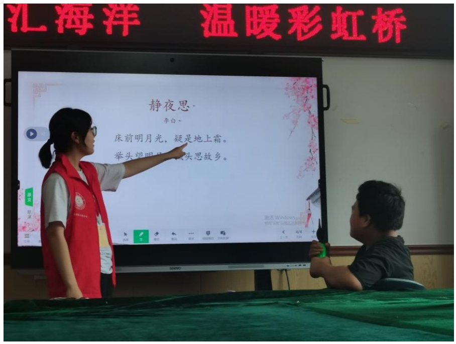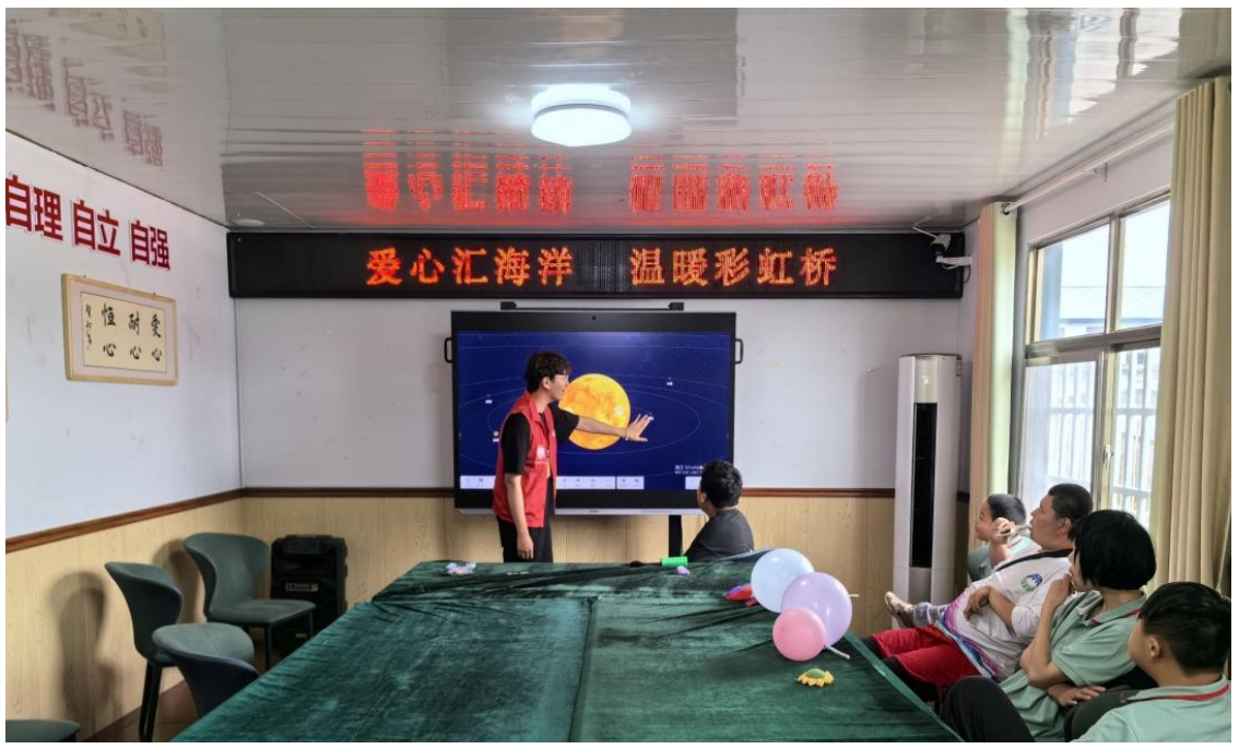 下午,志愿者开展智慧课堂,教授孩子们学古诗和儿歌、认识八大行星。他们或用优美的诗句和欢快的旋律,打开了孩子们对文学和音乐的大门;或用生动的图片和形象的语言,向孩子们介绍了宇宙中的八大行星。在志愿者们指导下,孩子们既领略了古诗的韵味,感受了儿歌的欢乐;又学到了知识,更加激发了对宇宙探索的兴趣。
