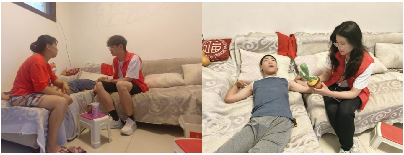 志愿者沙星宇、吕思越同学前往心智障碍者陶宏家,他是一个与志愿者年纪相仿的青年,却因出生时大脑缺氧而患有脑瘫。十九年来,他的父母始终如一地给予他无尽的关爱和照顾。陶宏看到志愿者的到来,脸上露出了无比开心的笑容。这份简单的陪伴,让他的眼中闪烁着喜悦的光芒。中午时分,陶宏的父亲为志愿者准备了一顿丰盛的午餐。在饭桌上,他与志愿者分享了许多人生的智慧和道理,让他们受益匪浅。午后,陶宏的母亲回忆起陶宏童年的点点滴滴,她的眼中不禁泛起了泪光。这些真挚的情感和故事,让志愿者深受感动,也让他们对人生的意义和价值有了更多的思考。