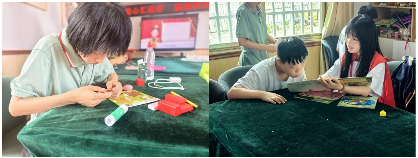 志愿者靳瑞、毛伊茜在专业护理人员的悉心指导下,陪伴孩子们进行了一系列的康复运动。这些活动包括轻松的伸展、平衡训练以及肢体协调练习,确保每位孩子都能在安全的环境中得到恰当的锻炼。随着活动的圆满结束,两位志愿者与孩子们共同回顾了这一段欢乐时光,对孩子的积极参与和不懈努力表示了由衷的赞扬和鼓励。在一片温馨和谐的氛围中,大家依依不舍地告别,并期待着下一次的相聚。互动让志愿者深刻感受到了耐心和爱心在与心智障碍儿童交流中的重要性。每个孩子都是独一无二的,他们有着不同的个性和需求。通过游戏和活动,不仅帮助他们学习新技能,还为他们提供了情感上的慰藉和社交上的机遇。