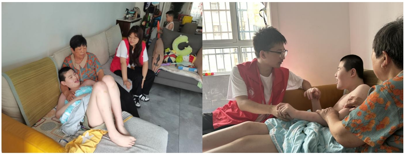 志愿者王乾忠、王雨彤前往另一户家庭。刚一踏入家门,便被奶奶的热情所包围。在这次家访中,志愿者们通过与奶奶的深入交流,了解到了孩子的具体情况,同时也陪伴孩子参与了一些简单的游戏,让他感受到了来自志愿者的关爱。这次家访不仅让他们更深入地理解了心智障碍儿童及其家庭的日常生活,也为大家未来的工作提供了宝贵的第一手资料。今天的志愿活动让他们深刻体会到了家访的重要性和深远意义。通过与心智障碍儿童及其家庭的直接接触,他们能够提供更为个性化和贴心的支持。