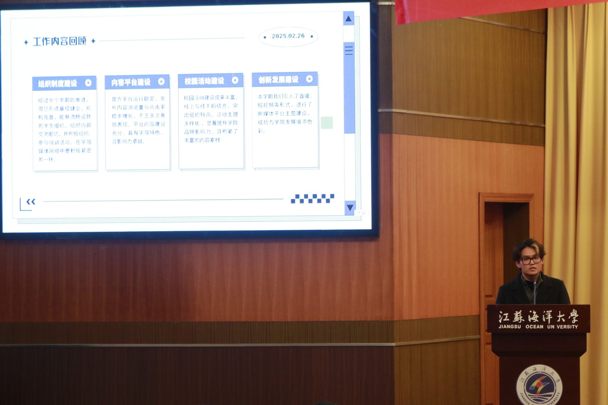 紧接着,学院研究生会、学生会、团委大成以及新媒体发展中心的负责人依次走上讲台,他们分别就自己所在组织的2024年工作回顾、问题总结与反思、新学期的工作部署以及对未来的展望等内容进行了详尽的汇报和深入的交流。通过这样的活动,不仅展示了各个学生组织的风采和能力,也体现了他们对责任和担当的深刻理解。