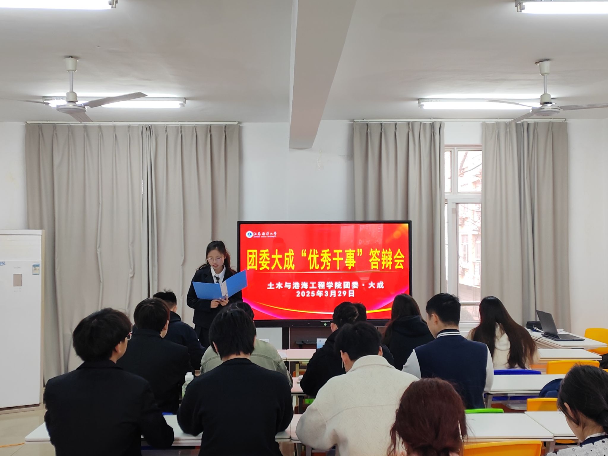 3月,土木与港海工程学院团委大成通过系列会议推进学生干部队伍建设,在通灌校区至善102教室、苍梧校区一站式学生社区A9/A10-205和线上腾讯会议分别举行全体大会暨优秀副部答辩会、优秀干事评优答辩会。活动由宣传部干事谭月主持,邀请学院团委书记卞辉老师、辅导员钟孟晨老师,以及文法学院、海洋食品与生物工程学院团委大成主任团成员担任评委,全体学生干部共同参与。