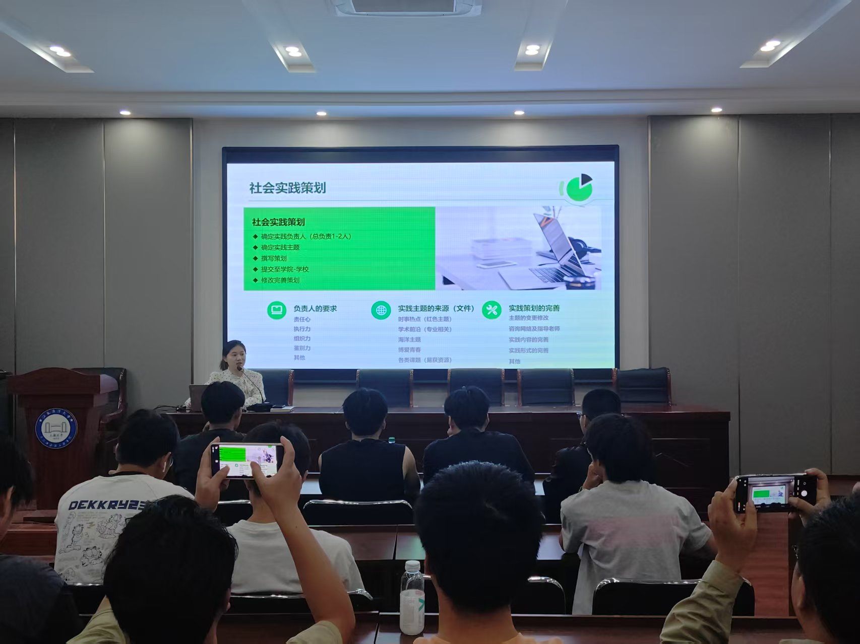 卞辉对所有团队负责人和团支书进行动员培训。她围绕社会实践的前期策划准备、中期实践实施以及后期的总结评优等关键环节,为同学们带来了一场收获满满的培训。在实践选题上,她强调要紧密结合社会热点和实际需求,突出创新性与可行性;在组织实施过程中,要做好前期调研、人员分工和时间规划,确保实践活动有序开展。尤其在活动总结上,她提出了五个“一”的工作要求并一一做了详尽的解释和举例,让参会的同学们深受启发。