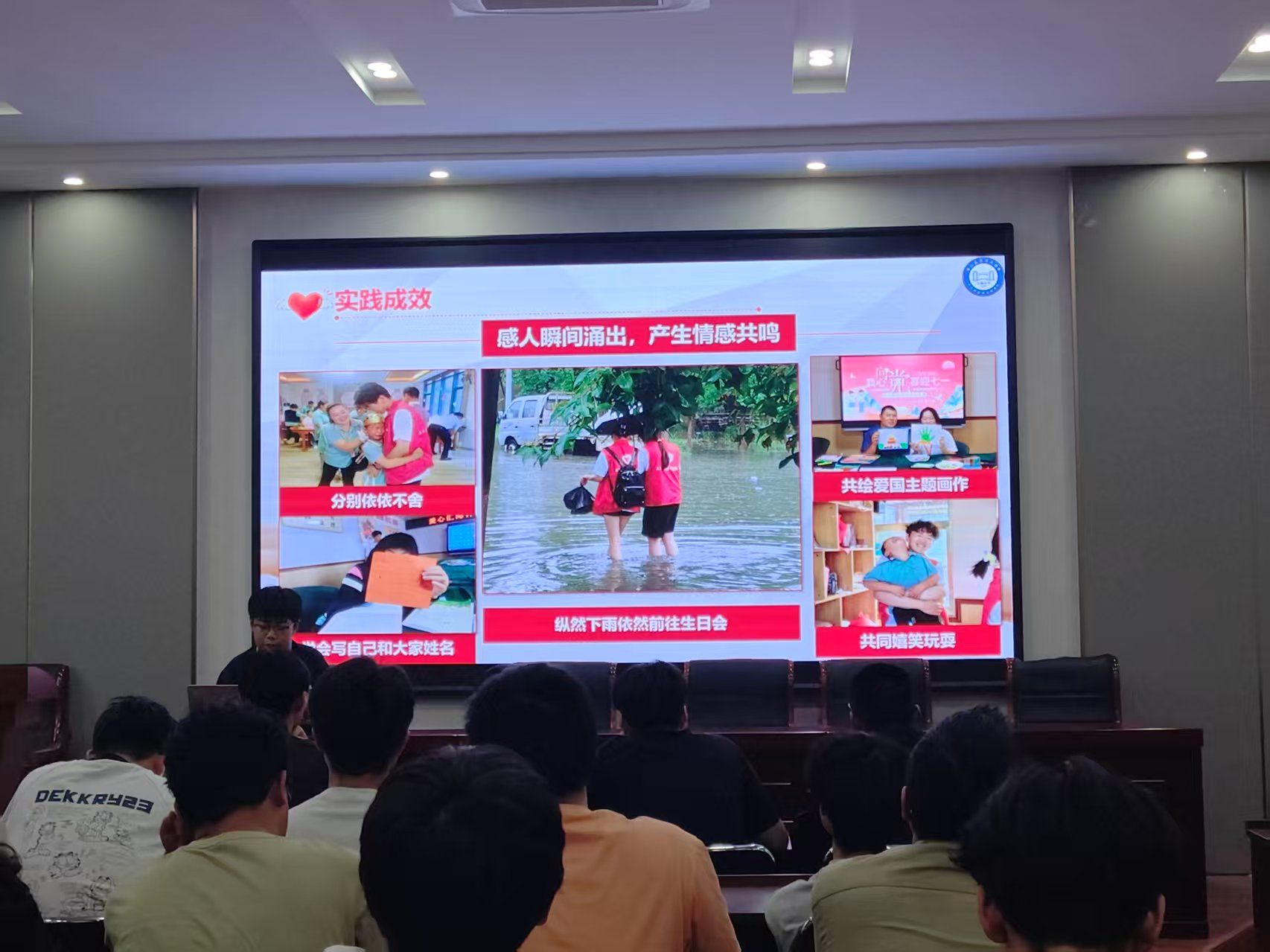 在经验分享环节,连云港市“博爱青春”暑期社会实践一等奖团队、江苏海洋大学暑期社会实践优秀团队负责人王智杰同学以2024年“温暖彩虹 爱心海洋——关爱心智障碍者及其家庭暑期社会实践”活动经历向学弟学妹们分享了宝贵经验。他讲述了在实践过程中克服困难、解决问题的经历,以及从中获得的成长与感悟。他认为,社会实践不仅是一次走出校园、接触社会的机会,更是一次自我挑战和突破的过程。其中,他重点强调要着力总结宣传,提高实践成效,也要注意按照格式要求,规范整理材料。他生动的讲述和真挚的建议,让参会同学对即将开展的暑期社会实践充满了期待。
