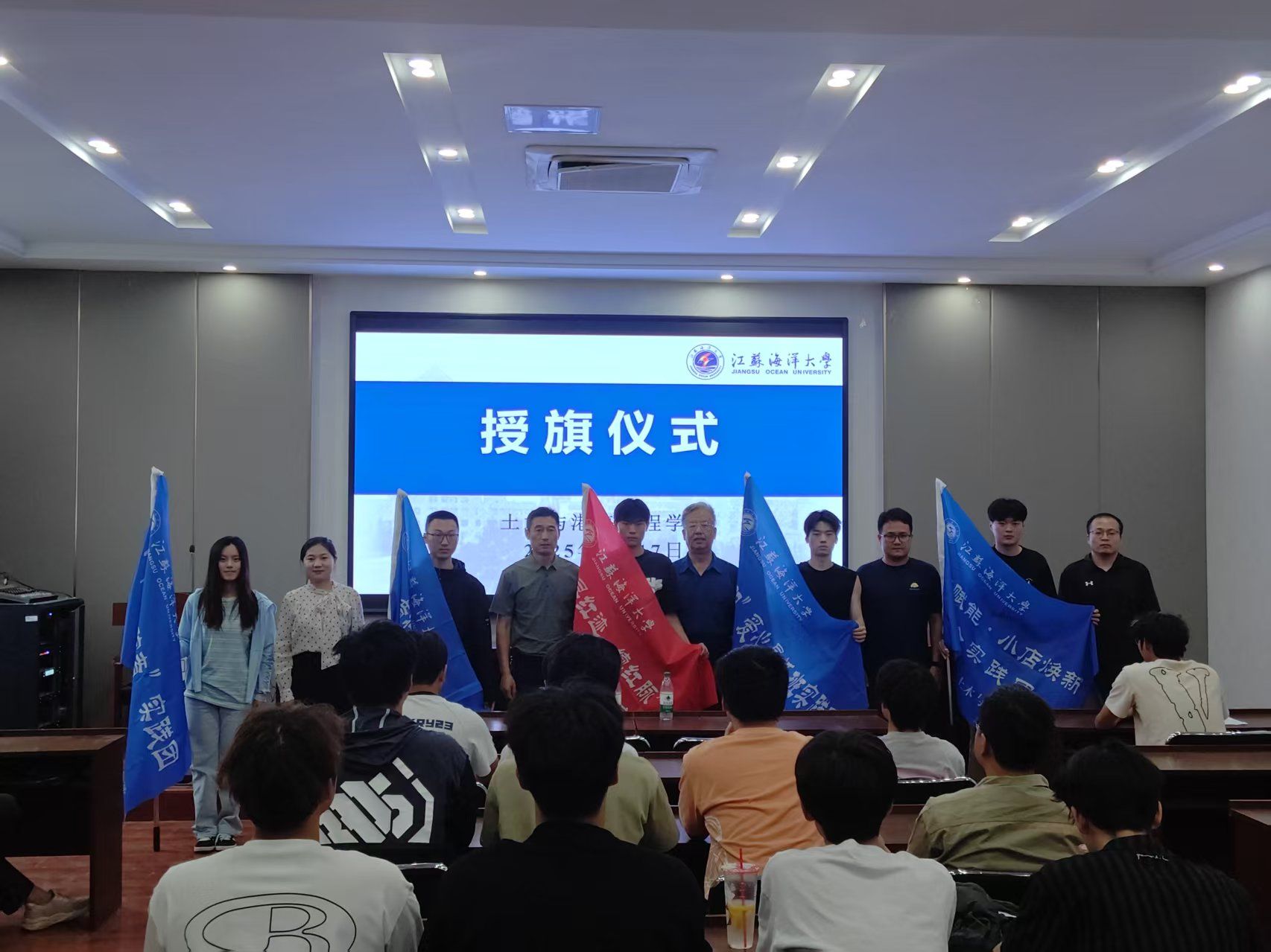 随后学院领导、各指导老师分别为“数字赋能·小店焕新”“微塑料追踪者”“筑梦童行” “寻红迹,续红脉”“砼心托阳”等五支社会实践团队代表授旗。