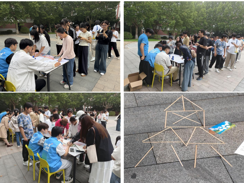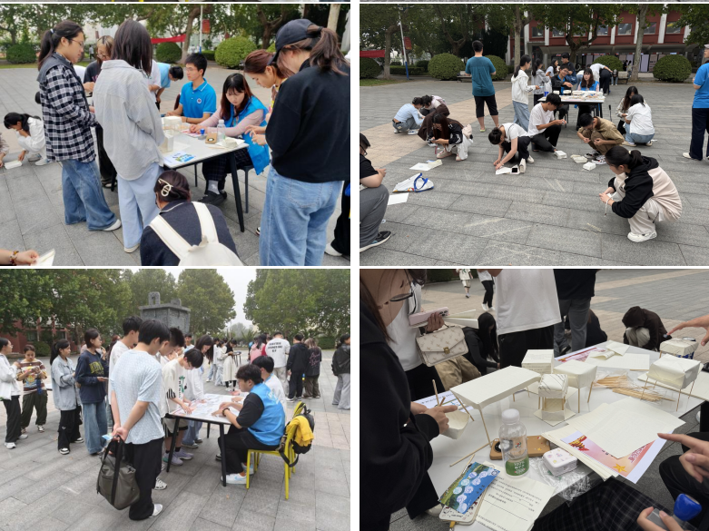 10月11日下午,通灌校区前程餐厅前广场活动现场,淅沥小雨中,百余名学生积极参与,热情不减。在“精神践行”拍照打卡任务点,同学们分组利用废旧一次性餐具、快递纸箱等材料,拼摆出“强核报国”标语图案,用环保实践诠释“自力更生”精神;“微型试验棚搭建”任务点中,学生组队完成“支架搭建—纸张固定—细节加固”挑战,通过木棍捆绑、废弃纸张覆盖等简易工艺模拟科研工作者艰苦条件下的创新实践,现场此起彼伏的协作讨论声与工具碰撞声交织成奋斗交响。