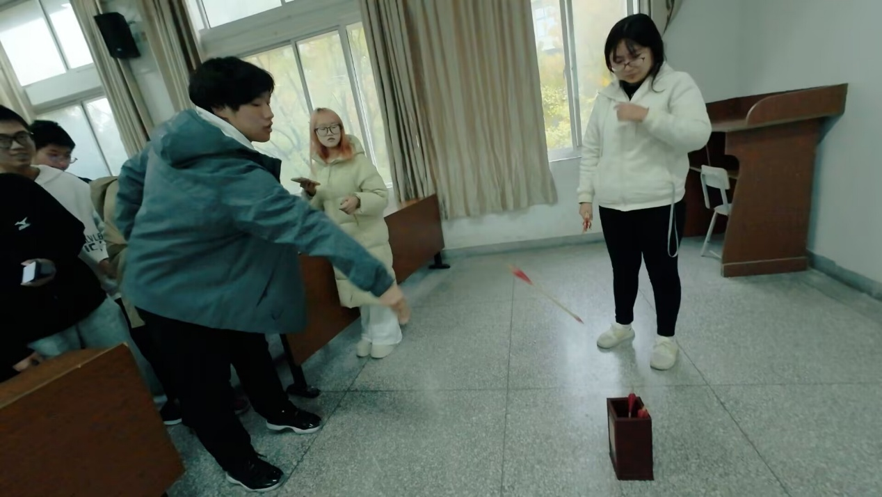 16时,比赛正式拉开帷幕。主持人首先为同学们讲解了投壶文化:“投壶起源于周代射礼,盛行于诸侯宴席,是集礼仪风度与竞技乐趣于一体的经典雅事,既考验专注力,又能修身养性。”这番生动的介绍让同学们对这项跨越千年的传统游戏增添了更多期待,也加深了他们对立冬节气文化的理解。