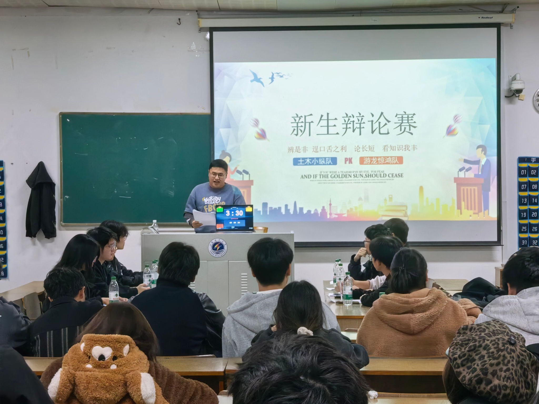 本次赛事由校学生会学习部主办,旨在通过理性思辨揭示熬夜本质,引导青年树立健康作息观念。参赛双方阵容强劲,正方“土木小纵队” 以 “熬夜是青年应对压力的功能性解药” 为核心论点,反方 “游龙惊鸿队” 则紧扣 “熬夜是身心健康的病态表征” 展开论述。评委团从论据科学性、逻辑严谨性、临场应变力等六大维度进行专业评判。