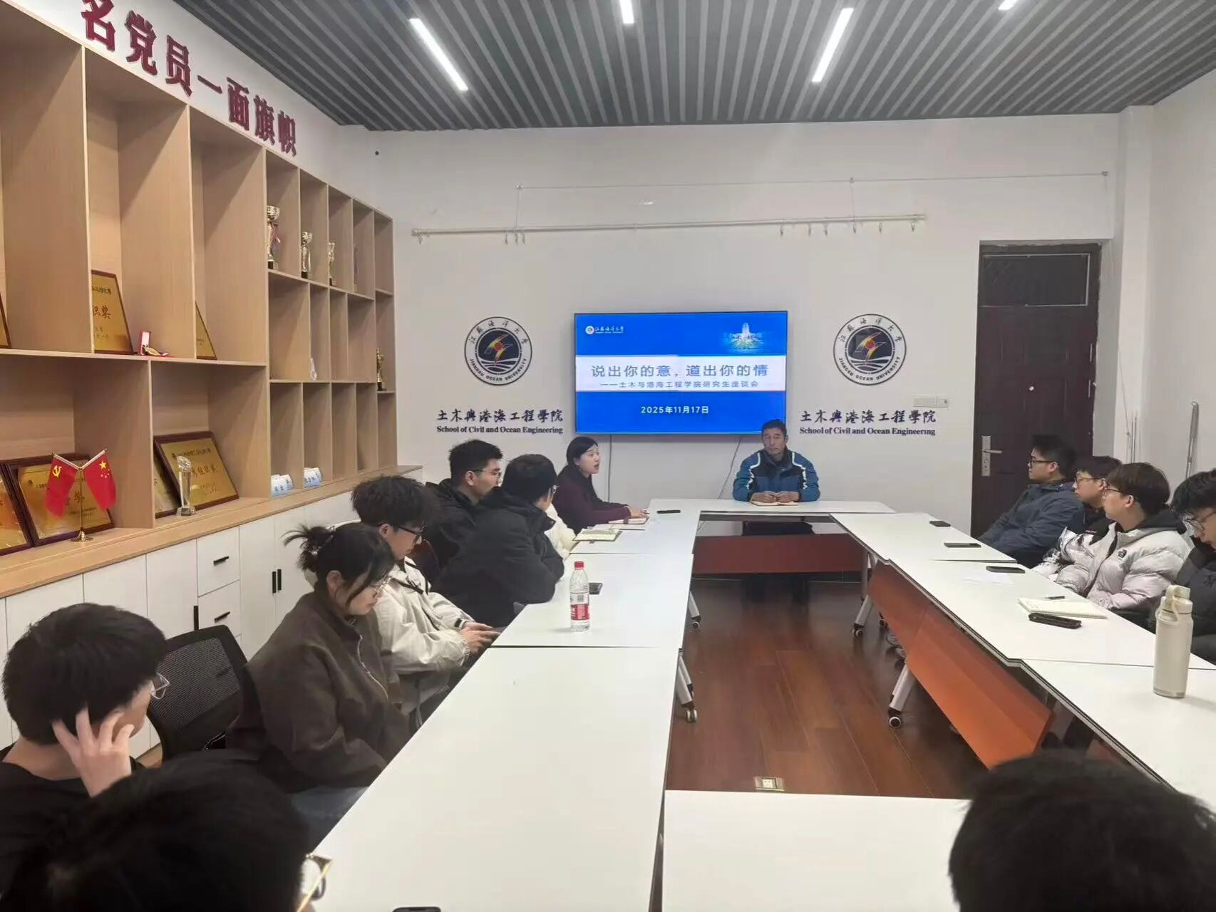 为进一步深入了解研究生在学习、科研和生活等方面的实际需求,切实提升学院研究生人才培养质量和管理服务水平,土木与港海工程学院于2025年11月17日在土木北楼318室召开了研究生代表座谈会。学院党委副书记魏学庆、研究生辅导员卞辉、研究生教学秘书肖淑杰出席会议,与来自学院三个年级的17名研究生代表。