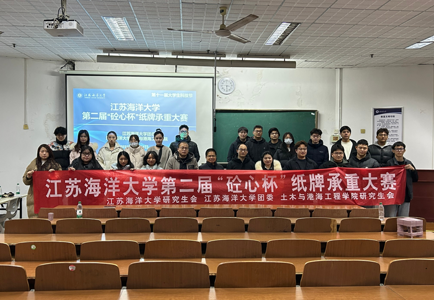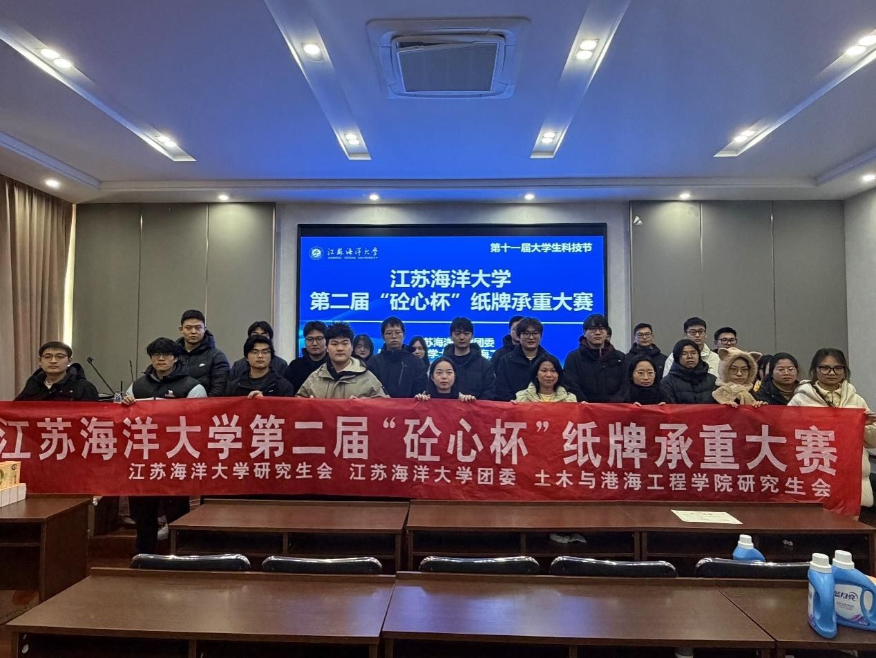 为深入贯彻江苏海洋大学第十一届大学生科技节“智启新程汇海韵,创引未来耀青春”的活动宗旨,近日,由学校研究生院和团委联合主办、土木与港海工程学院精心承办的第二届“砼心杯”纸牌承重大赛圆满落幕。本次大赛以“轻材亦可承重,创意方能致远”为核心理念,旨在搭建理论与实践深度融合的育人平台,引导学生锤炼创新思维、提升动手能力与团队协作意识。