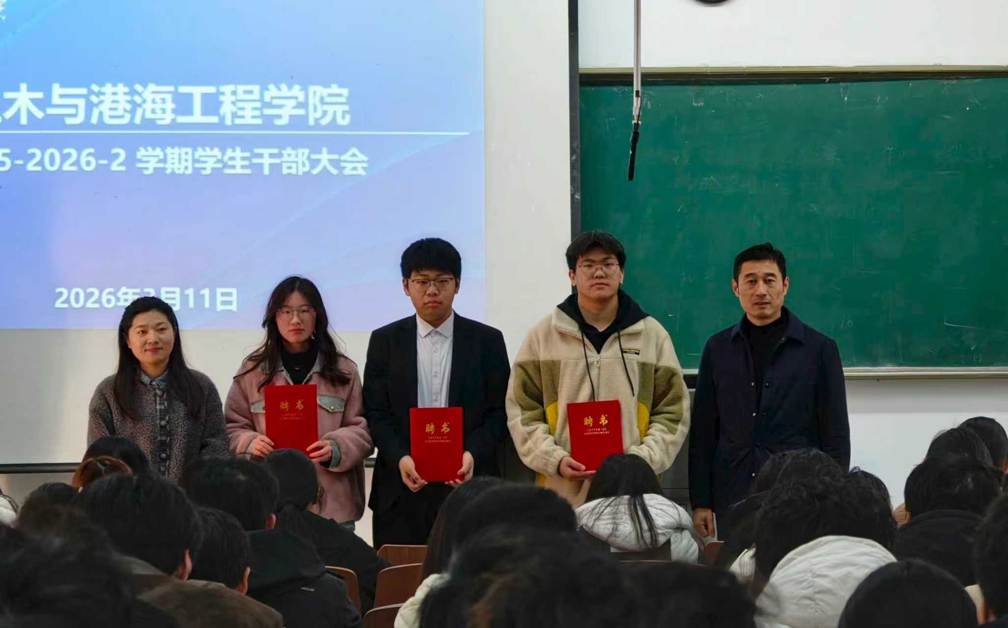 春启新程,逐梦前行。为全面复盘上学期学生工作成效,系统部署新学期重点任务,凝聚学生干部奋进力量,持续提升学院学生工作质效,土木与港海工程学院召开2025-2026学年第二学期学生干部工作大会。会议围绕学生干部聘书颁发与经验分享、重点工作部署、干部能力提升等内容展开,学院党委副书记魏学庆、团委书记卞辉、学生工作办公室负责人马超、辅导员钟孟晨、李旭丰出席会议,学院团委、学生会、新媒体发展中心全体学生干部,各班班长、团支书及信息安全员参会。
