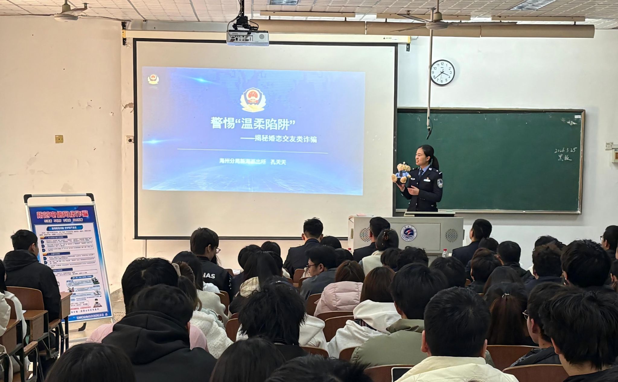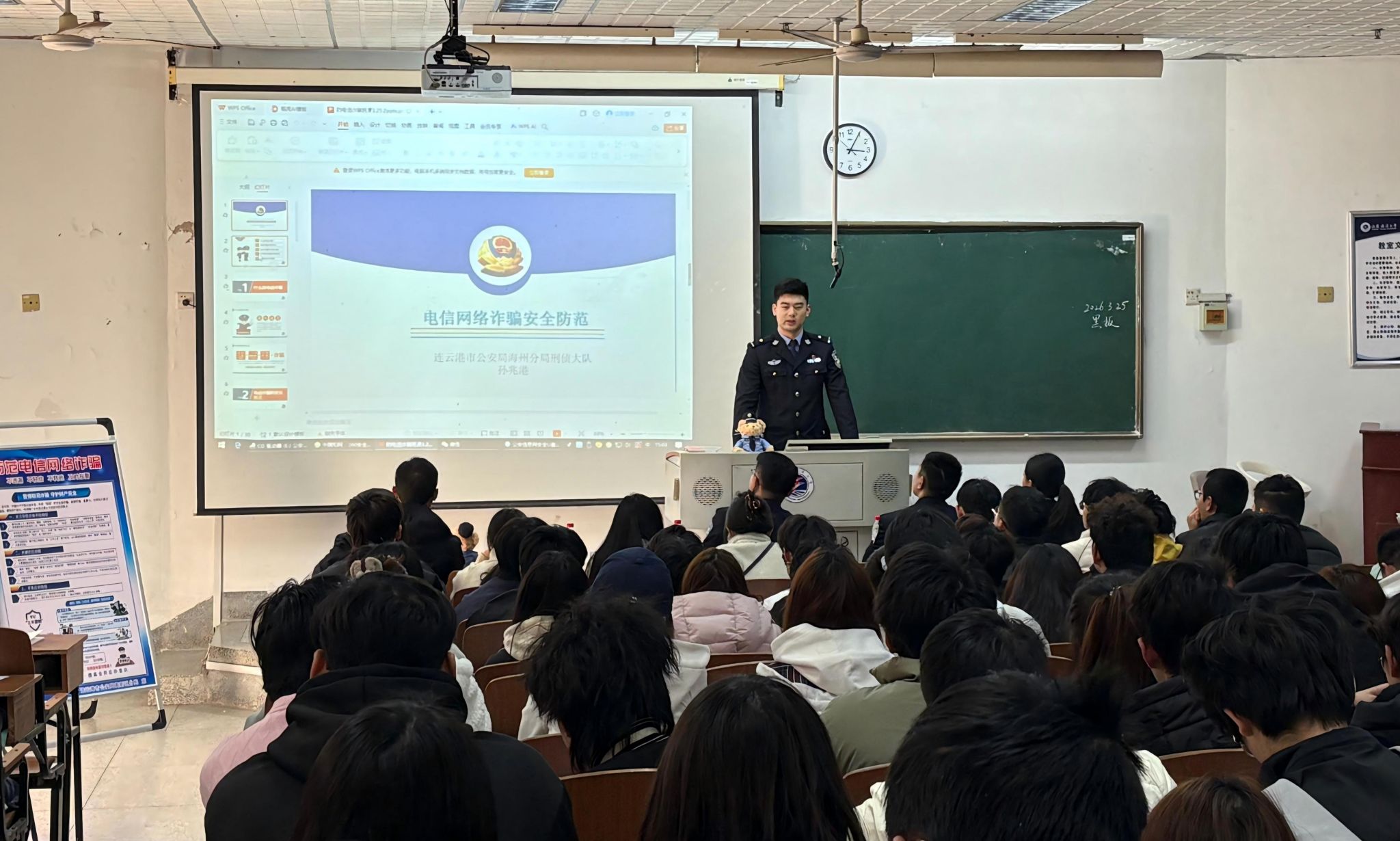 为进一步强化学院学生反诈防骗意识,校保卫处和土木与港海工程学院于3月25日邀请郁洲派出所副所长陈贺、民警徐福兴、相星宇,海州公安分局刑侦大队民警孙兆港,新海派出所民警孔天天等五位警官走进校园发放反诈宣传单,开展“反诈护航青春,安全守护成长”主题讲座。学院辅导员、班长、信息安全员等参加本次讲座,讲座由学院党委副书记魏学庆主持。