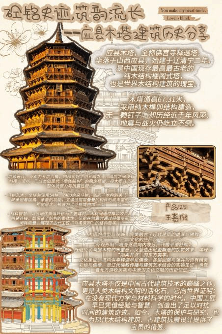 活动中,同学们以图文并茂的形式,分享了从应县木塔到都梁阁等经典建筑的深厚底蕴。有同学细致拆解应县木塔“无钉无铆、纯木构”的榫卯智慧,讲解其历经千年风雨仍屹立不倒的结构奥秘,展现中国古代工匠“以柔克刚”的建筑哲学;也有同学聚焦盱眙都梁阁,从重檐歇山顶的形制、飞檐翘角的灵动造型,到6层通高46.9米的现代框架结构,解读传统建筑美学与当代工程技术的融合,让古老建筑文化在新时代焕发生机。投稿作品兼具专业深度与人文温度,既包含对建筑材料、结构力学等土木专业知识的剖析,也承载着对“天人合一”东方美学的感悟。