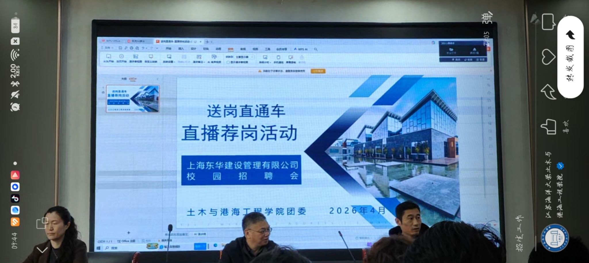 为拓宽毕业生就业渠道,精准对接行业优质岗位,助力2026届毕业生高质量就业,近日,土木与港海工程学院团委举办上海东华建设管理有限公司“送岗直通车”直播荐岗暨专场招聘会。学院党委副书记魏学庆出席活动,上海东华建设管理有限公司总工程师姜海福、综合办主任周利华担任宣讲人,二十余名港航专业2026届毕业生参与本次活动。