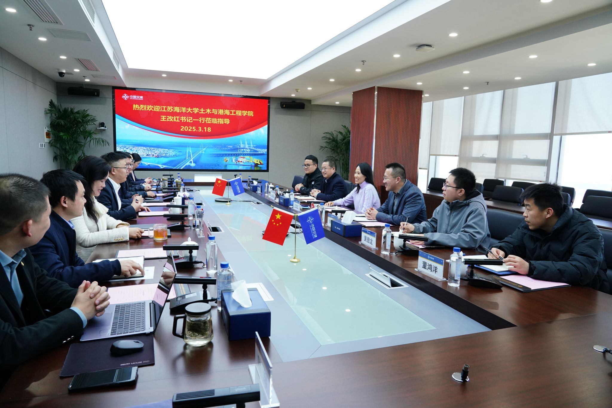 3月18日,学院党委书记王改红、院长朱文谨一行带队赴中交三航局江苏分公司开展校企合作交流。中交三航局江苏分公司党委副书记、执行总经理王超,党委副书记、纪委书记、工会主席刘祺,总会计师、总法律顾问王倩一同参加。