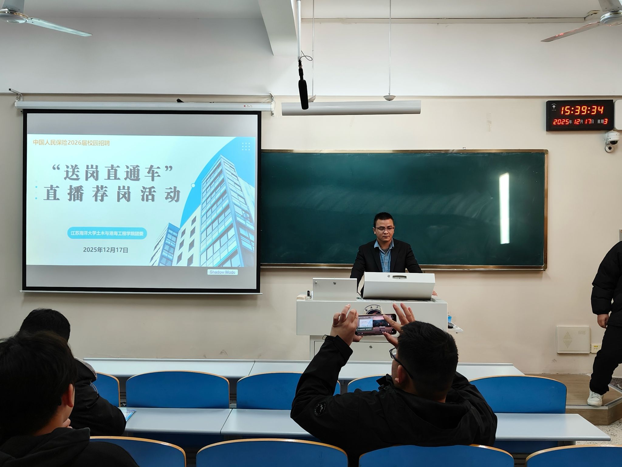 为全面落实学院2026届毕业生的高质量就业工作,搭建校企精准对接的桥梁,12月17日,土木与港海工程学院团委携手中国人民保险,共同打造了“送岗直通车”直播荐岗与线下专场招聘会的双重模式。在文华楼301教室,为工程管理专业2026届毕业生提供了优质的就业岗位。学院党委副书记魏学庆、辅导员钟孟晨组织毕业生积极参与,线上线下联动,助力学子精准对接国企资源。